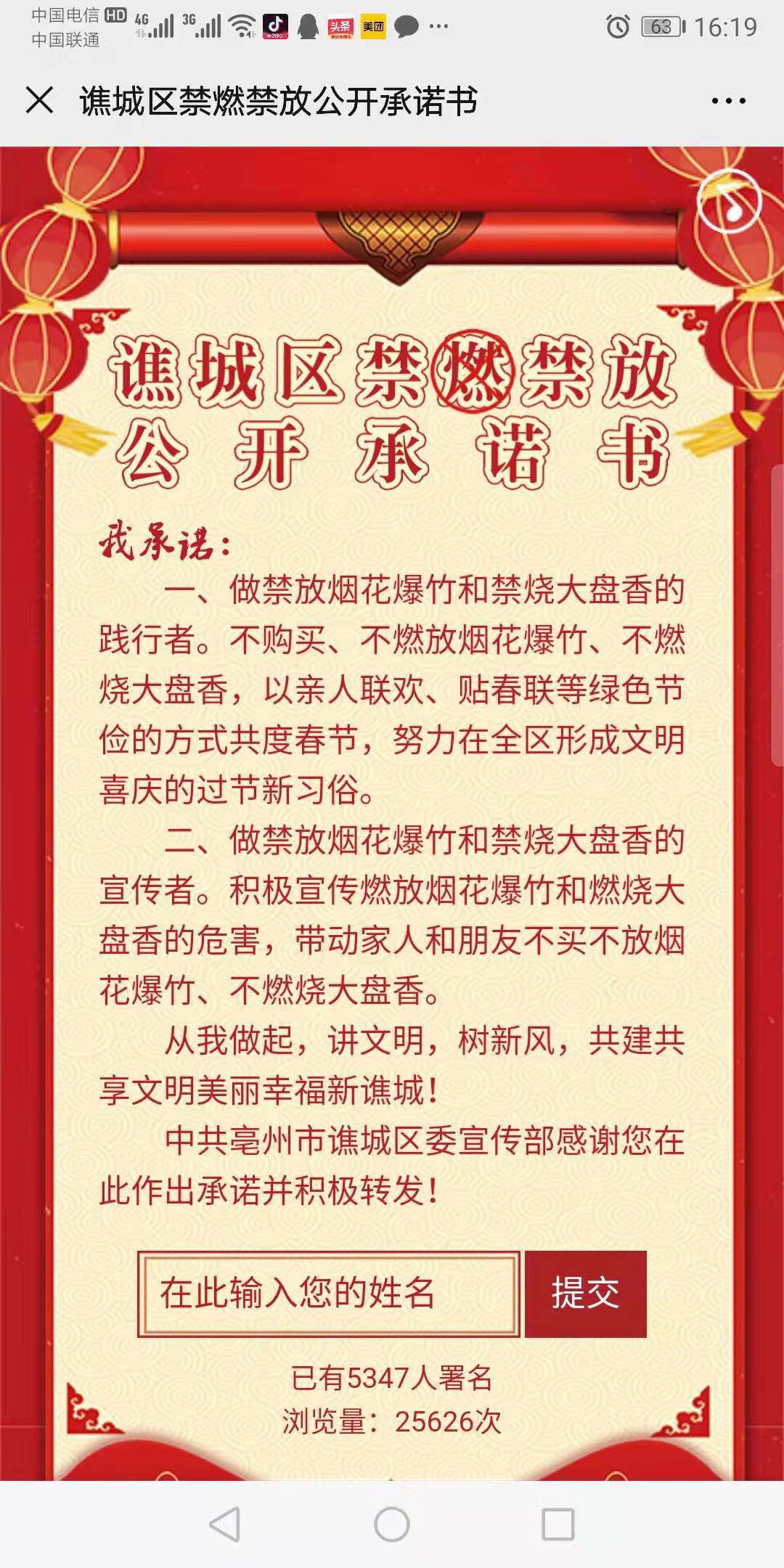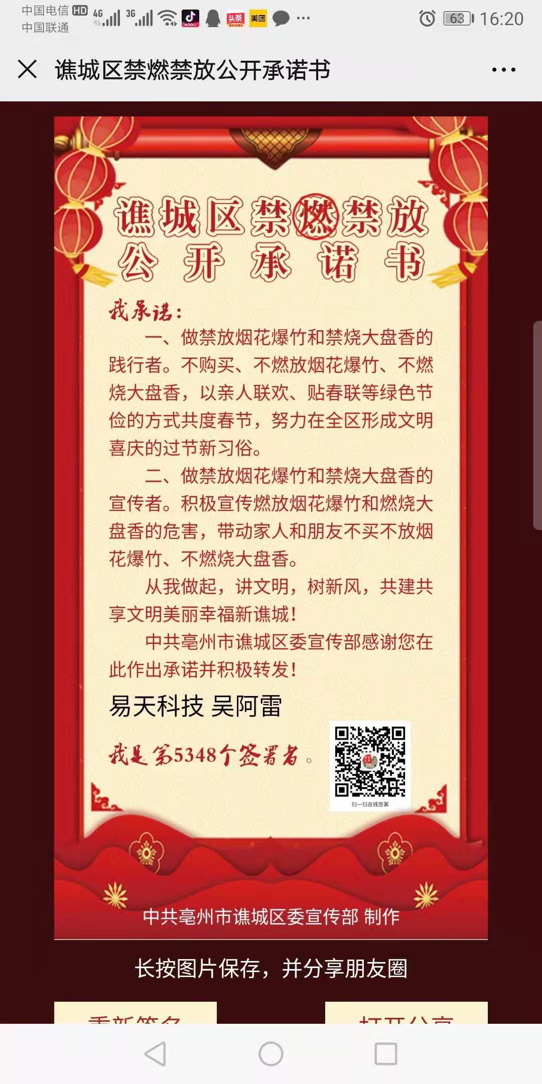 譙城區(qū)禁燃禁放公開承諾書我承諾:一、做禁放煙花爆竹和禁燒大盤香的踐行者。不購買、不燃放煙花爆竹、不燃燒大盤香,以親人聯(lián)歡、貼春聯(lián)等綠色節(jié)儉的方式共度春節(jié),努力在全區(qū)形成文明喜慶的過節(jié)新習俗。二、做禁放煙花爆竹和禁燒大盤香的宣傳者。積極宣傳燃放煙花爆竹和燃燒大盤香的危害,帶動家人和朋友不買不放煙花爆竹、不燃燒大盤香。從我做起,講文明,樹新風,共建共享文明美麗幸福新譙城!譙城區(qū)委宣傳部感謝您在此作出承諾并積極轉(zhuǎn)發(fā)??
